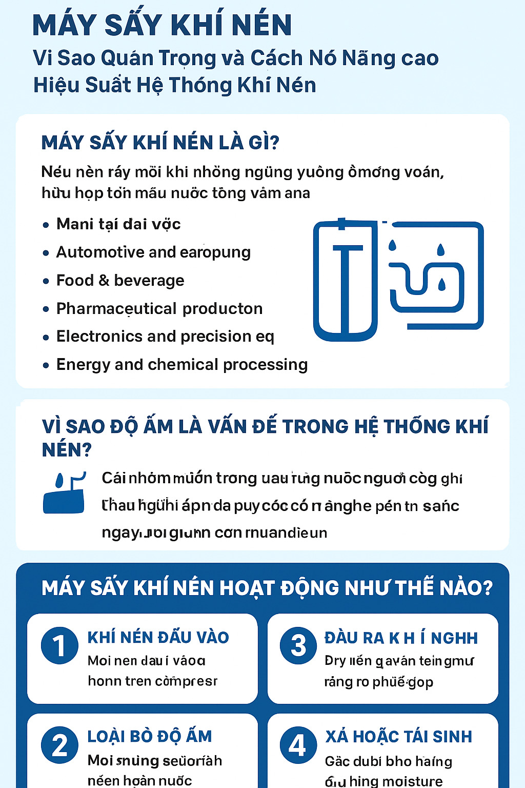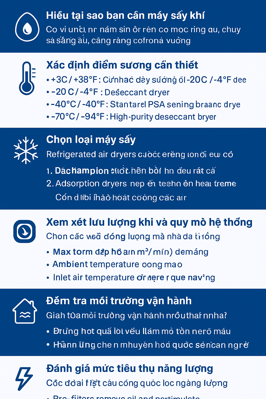 Việc lựa chọn đúng máy sấy khí nén là một trong những quyết định quan trọng nhất để đảm bảo khí nén sạch, khô và