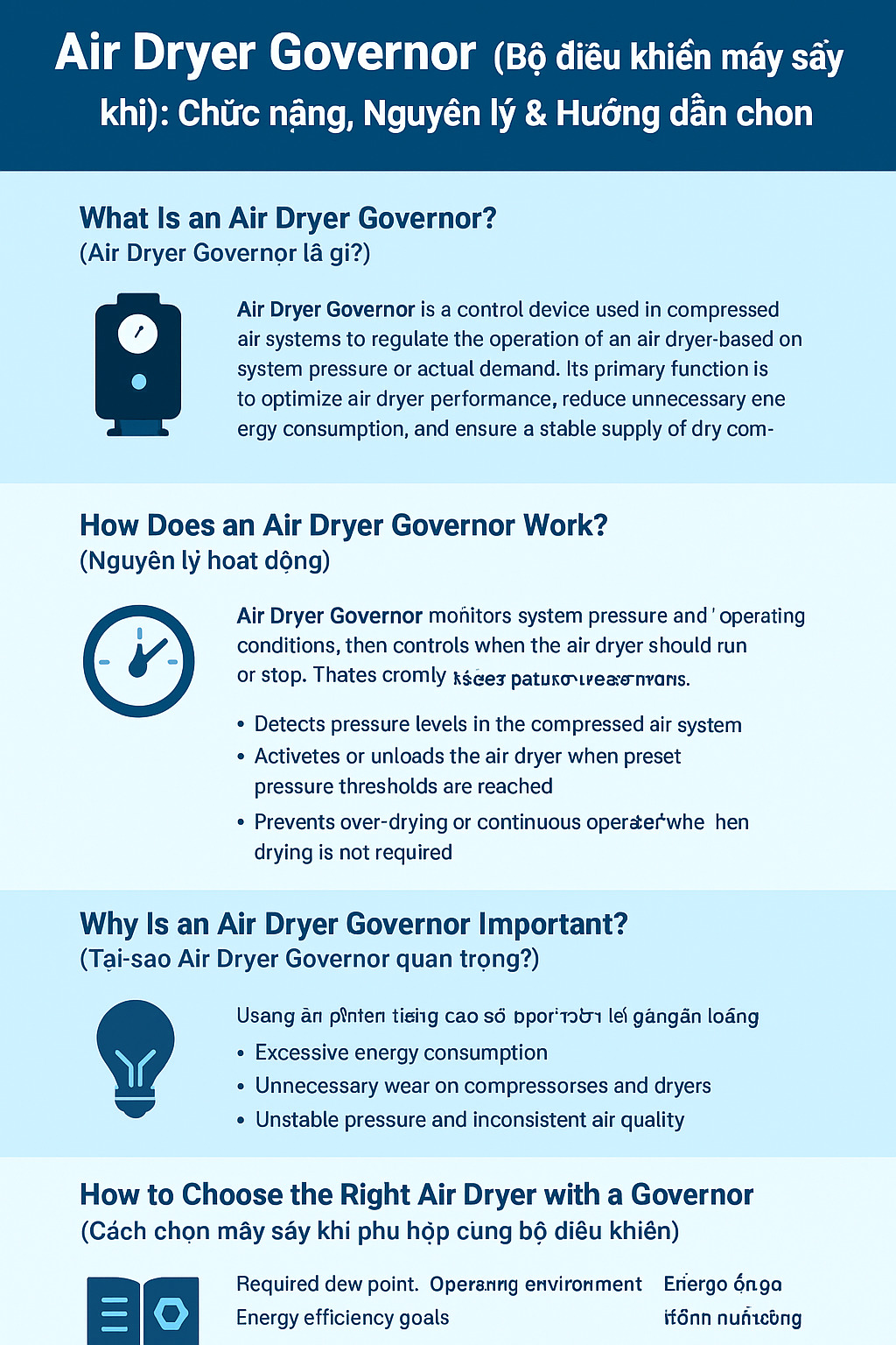 Bộ điều khiển máy sấy khí? bộ điều khiển máy sấy khí (Air Dryer Governor) là một thiết bị điều khiển được sử dụng trong
