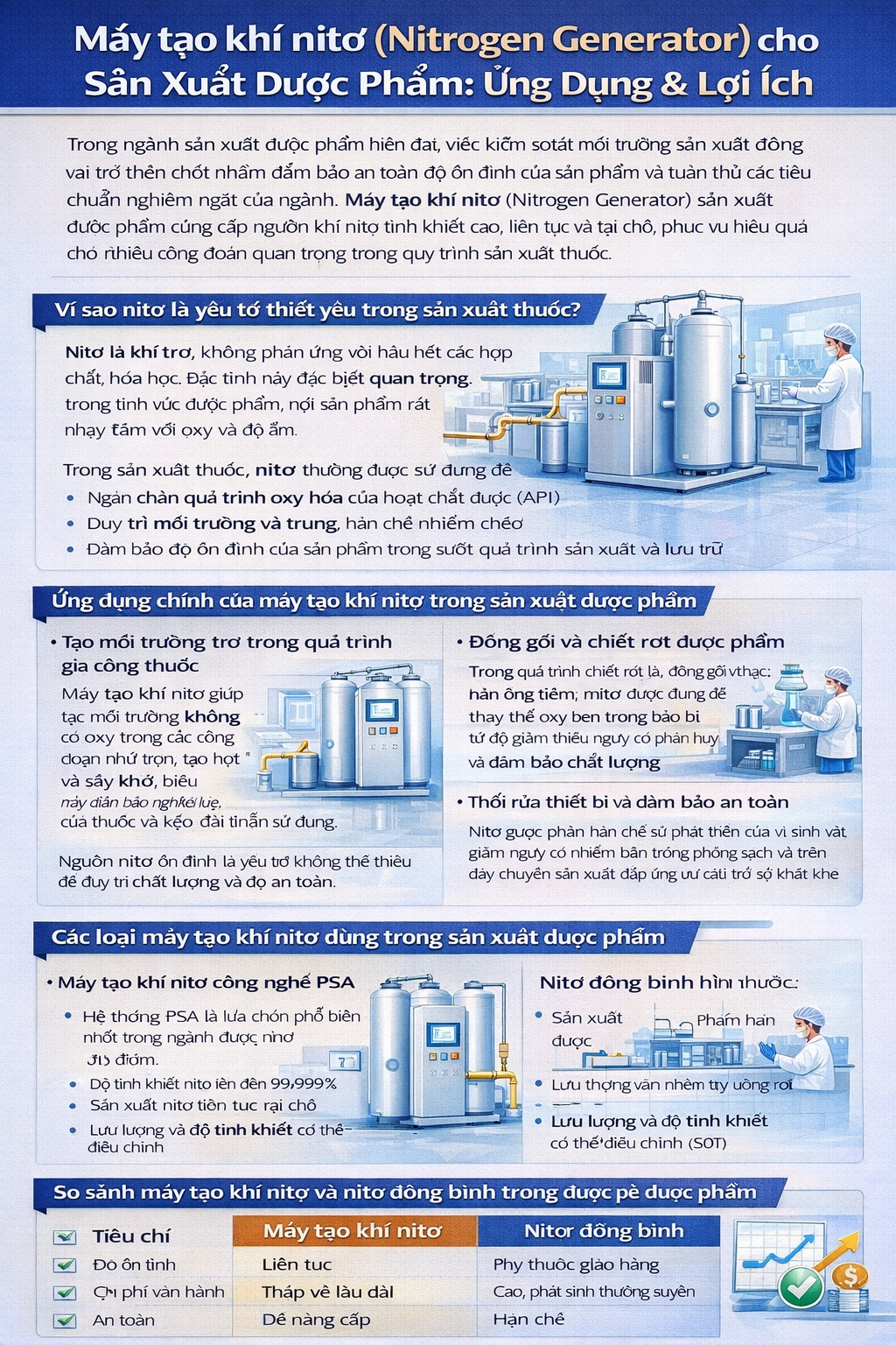 Máy tạo khí nitơ(Nitrogen Generator) cho sản xuất dược phẩm Trong ngành sản xuất dược phẩm hiện đại, việc kiểm soát môi trường sản xuất