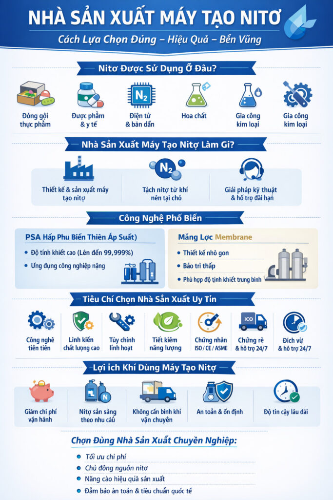 Nitơ được sử dụng rộng rãi trong nhiều ngành công nghiệp như đóng gói thực phẩm, dược phẩm, điện tử, hóa chất và gia công kim loại. Khi nhu cầu sản xuất nitơ tại chỗ ngày càng tăng, nhiều doanh nghiệp đang chuyển sang sử dụng máy tạo nitơ như một giải pháp tiết kiệm chi phí và đáng tin cậy. Việc lựa chọn nhà sản xuất máy tạo nitơ phù hợp là một quyết định quan trọng, ảnh hưởng trực tiếp đến hiệu suất hệ thống, chi phí vận hành và độ tin cậy lâu dài.