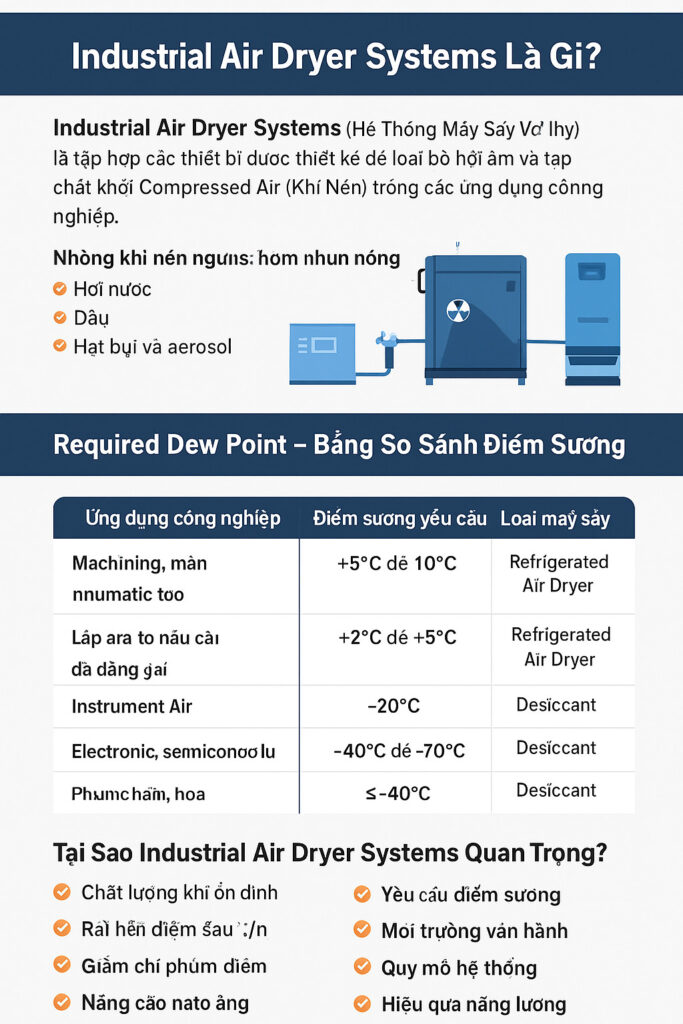 Hệ Thống Máy Sấy Khí Công Nghiệp (Industrial Air Dryer Systems) là tập hợp các thiết bị được thiết kế để loại bỏ hơi ẩm và tạp chất khỏi Khí Nén (Compressed Air) trong các ứng dụng công nghiệp.