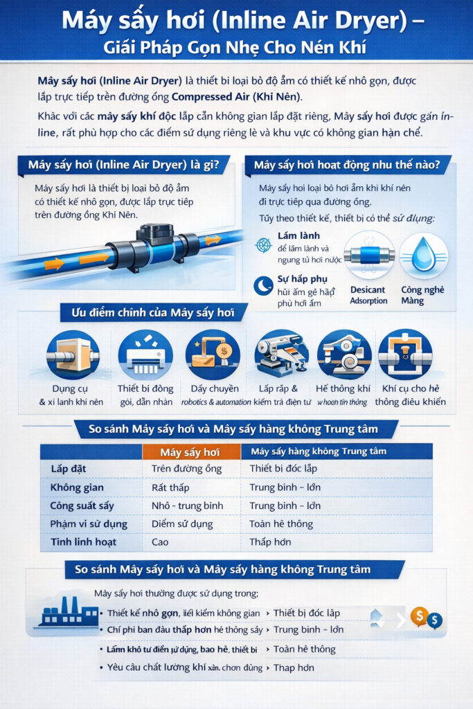 Máy sấy hơi(Inline Air Dryer) là thiết bị loại bỏ độ ẩm có thiết kế nhỏ gọn, được lắp trực tiếp trên đường ống Compressed Air (Khí Nén).