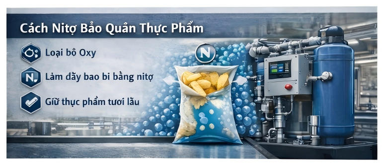 Nitơ là một loại khí trơ được sử dụng rộng rãi trong bảo quản thực phẩm vì nó giúp giảm lượng oxy bên trong bao bì. Do oxy là một trong những nguyên nhân chính gây suy giảm chất lượng thực phẩm, việc thay thế oxy bằng nitơ có thể làm chậm đáng kể quá trình oxy hóa, duy trì kết cấu, giữ hương vị và cải thiện độ ổn định tổng thể của các sản phẩm thực phẩm đóng gói.