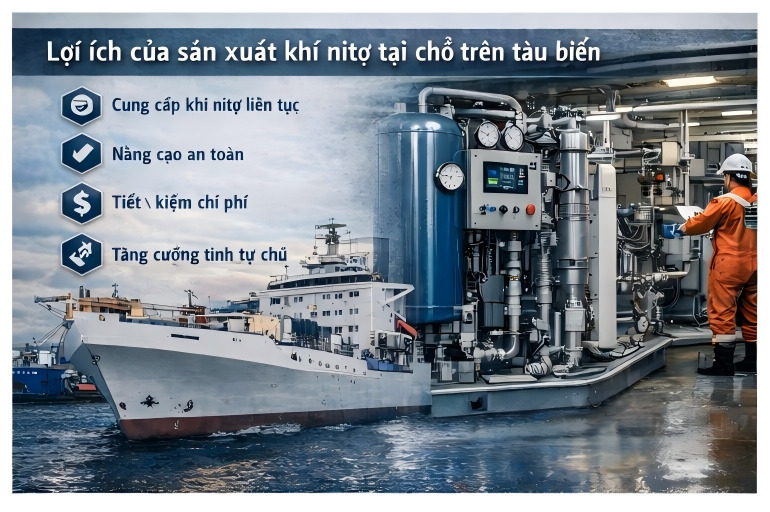 Việc lắp đặt máy tạo nitơ trên tàu mang lại nhiều lợi ích quan trọng so với các phương thức cung cấp nitơ truyền thống.