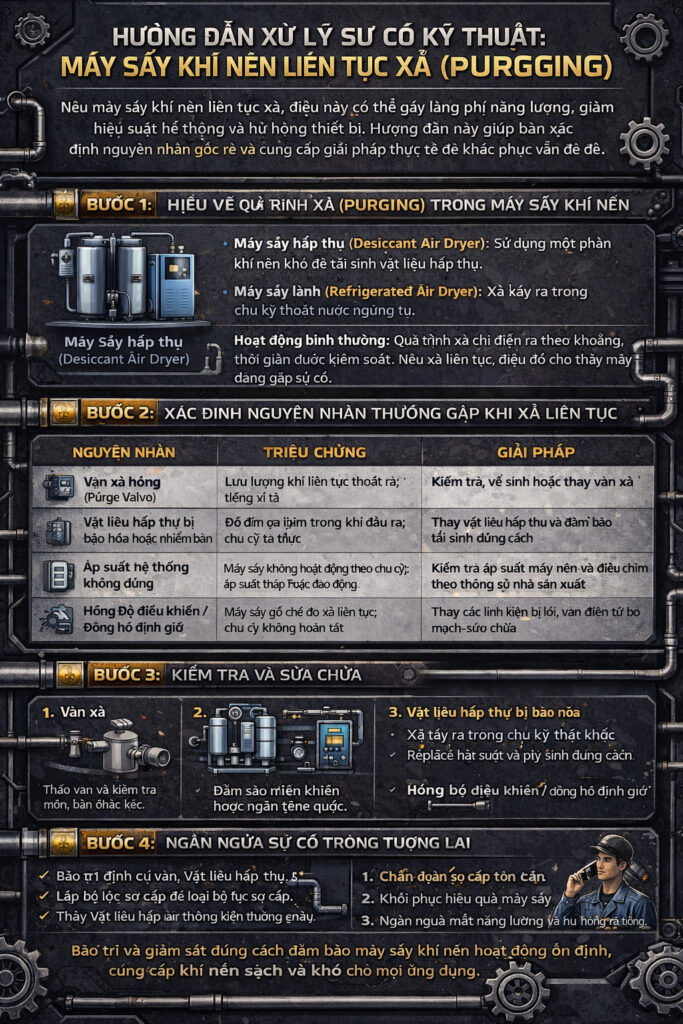 Nếu máy sấy khí nén liên tục xả, điều này có thể gây lãng phí năng lượng, giảm hiệu quả hệ thống và hư hỏng thiết bị. Hướng dẫn này giúp bạn xác định nguyên nhân gốc rễ và cung cấp giải pháp thực tế để khắc phục vấn đề.
