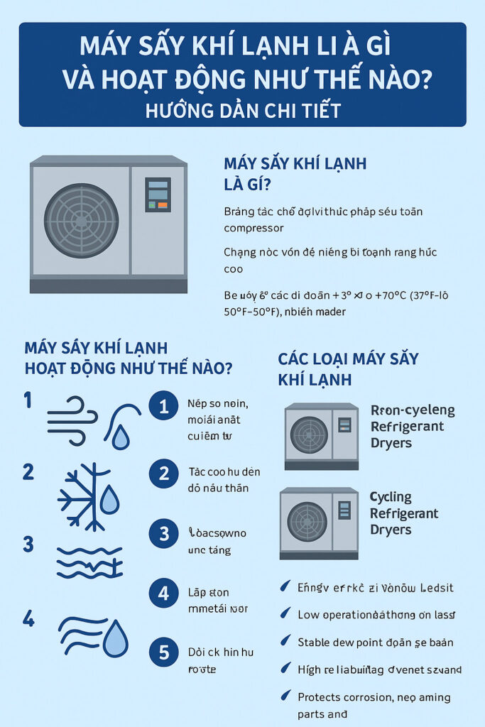 Máy sấy khí lạnh thường đạt điểm sương khoảng +3°C đến +10°C (37°F–50°F), rất lý tưởng cho các ứng dụng thông dụng không yêu cầu khí siêu khô.