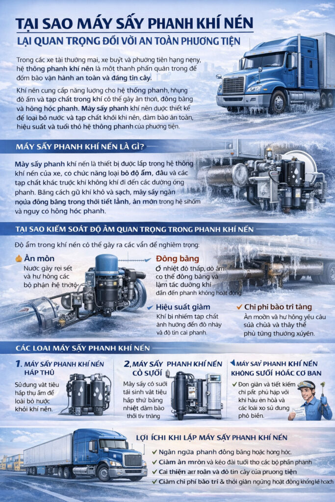 Máy sấy phanh khí nén là thiết bị được lắp trong hệ thống khí nén của xe, có chức năng loại bỏ độ ẩm, dầu và các tạp chất khác trước khi không khí đi đến các đường ống phanh. Bằng cách giữ khí khô và sạch, máy sấy ngăn ngừa đóng băng trong thời tiết lạnh, ăn mòn trong hệ thống và nguy cơ hỏng hóc phanh.